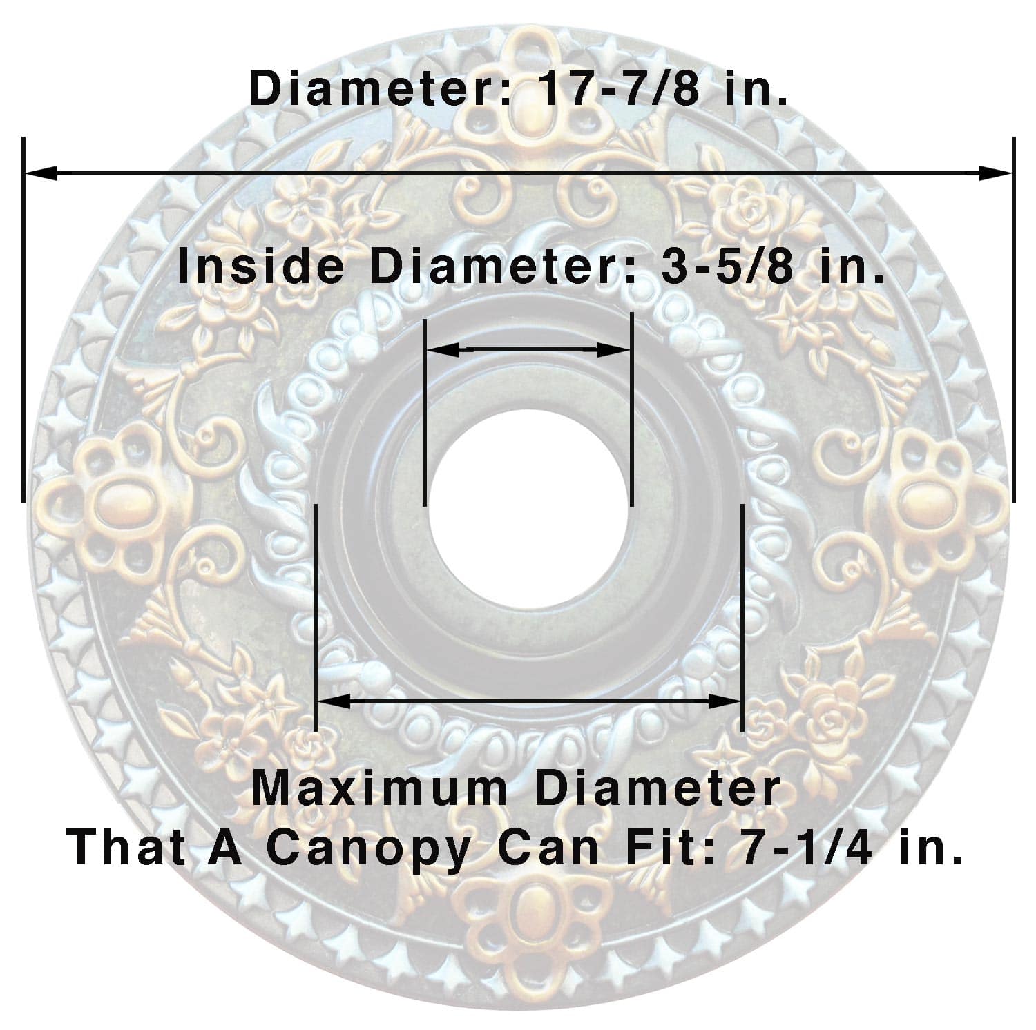 In most of the ceiling medallions, the design close to the center area allows to place a canopy wider than the inside diameter that comes from factory, That’s the maximum diameter that a canopy can fit (view product specifications), a small design area around the center hole might be covered but you save the canopy (recommended). Other option is to replace your canopy for a smaller one that fits the inside diameter (only if your canopy is bigger than the maximum diameter that a canopy can fit).