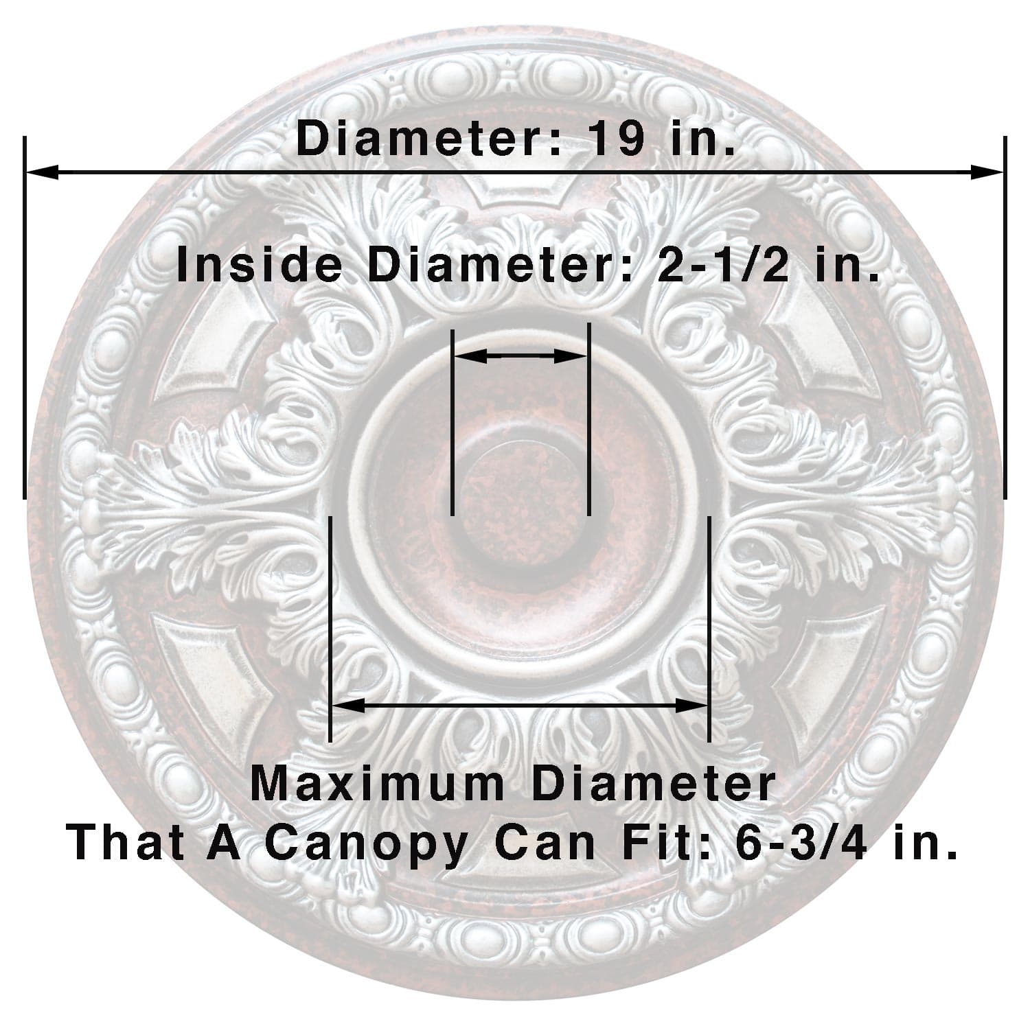 In most of the ceiling medallions, the design close to the center area allows to place a canopy wider than the inside diameter that comes from factory, That’s the maximum diameter that a canopy can fit (view product specifications), a small design area around the center hole might be covered but you save the canopy (recommended). Other option is to replace your canopy for a smaller one that fits the inside diameter (only if your canopy is bigger than the maximum diameter that a canopy can fit).