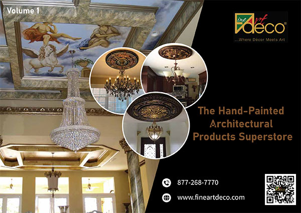 Our new Volume 1 Catalog offers a complete collection of hand-painted architectural products like ceiling medallions, ceiling rings, ceiling tiles, crown molding, flat moldings, doors and window casings, baseboards, columns, corbels, wall niches, ornaments, etc. We have also added a variety of new products and features that you can look for in this new Volume 1. We will be offering new catalog volumes in the future as we release new products.